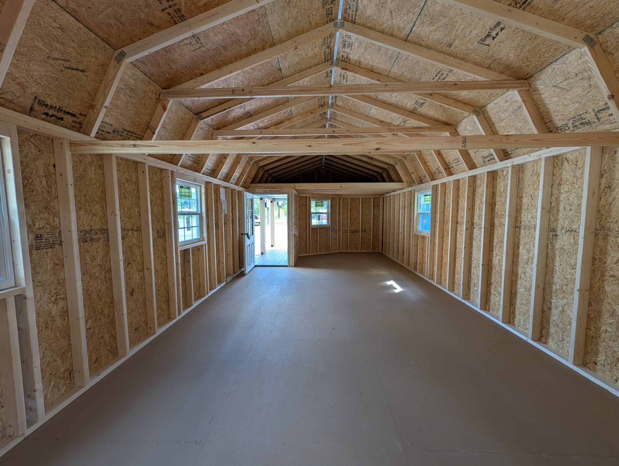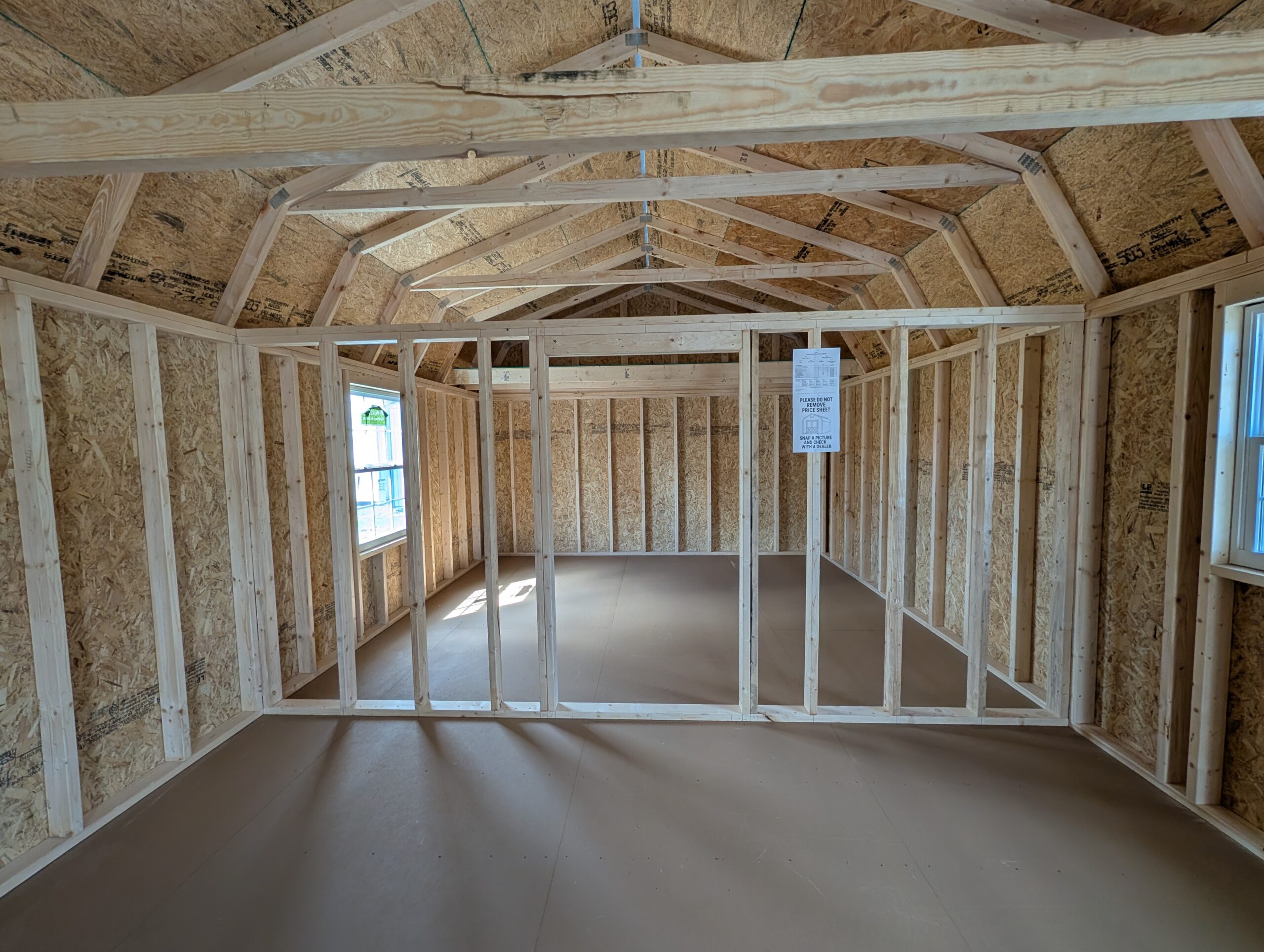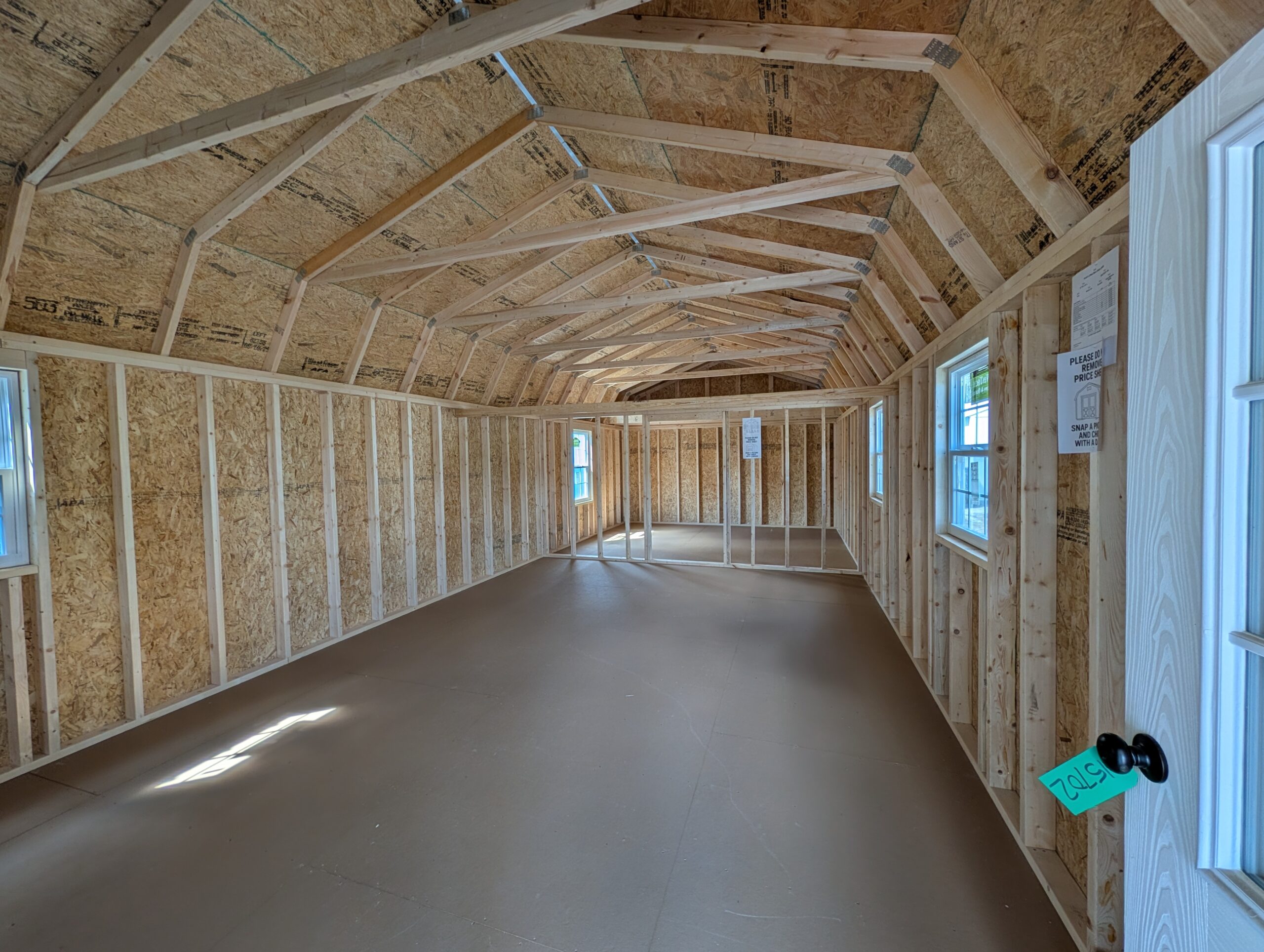4′ W x 44′ L 1 x 9-Lite Entry Door 2 x 14′ Wide Loft Space 4 x 30×36 Thermal Windows (White) 1 x 36×48 Thermal Window (WHITE) 1 x Black POSTS 1 x Stud Wall (framing only) 1 x Door Frame Out 1 x Frame wall up to truss
