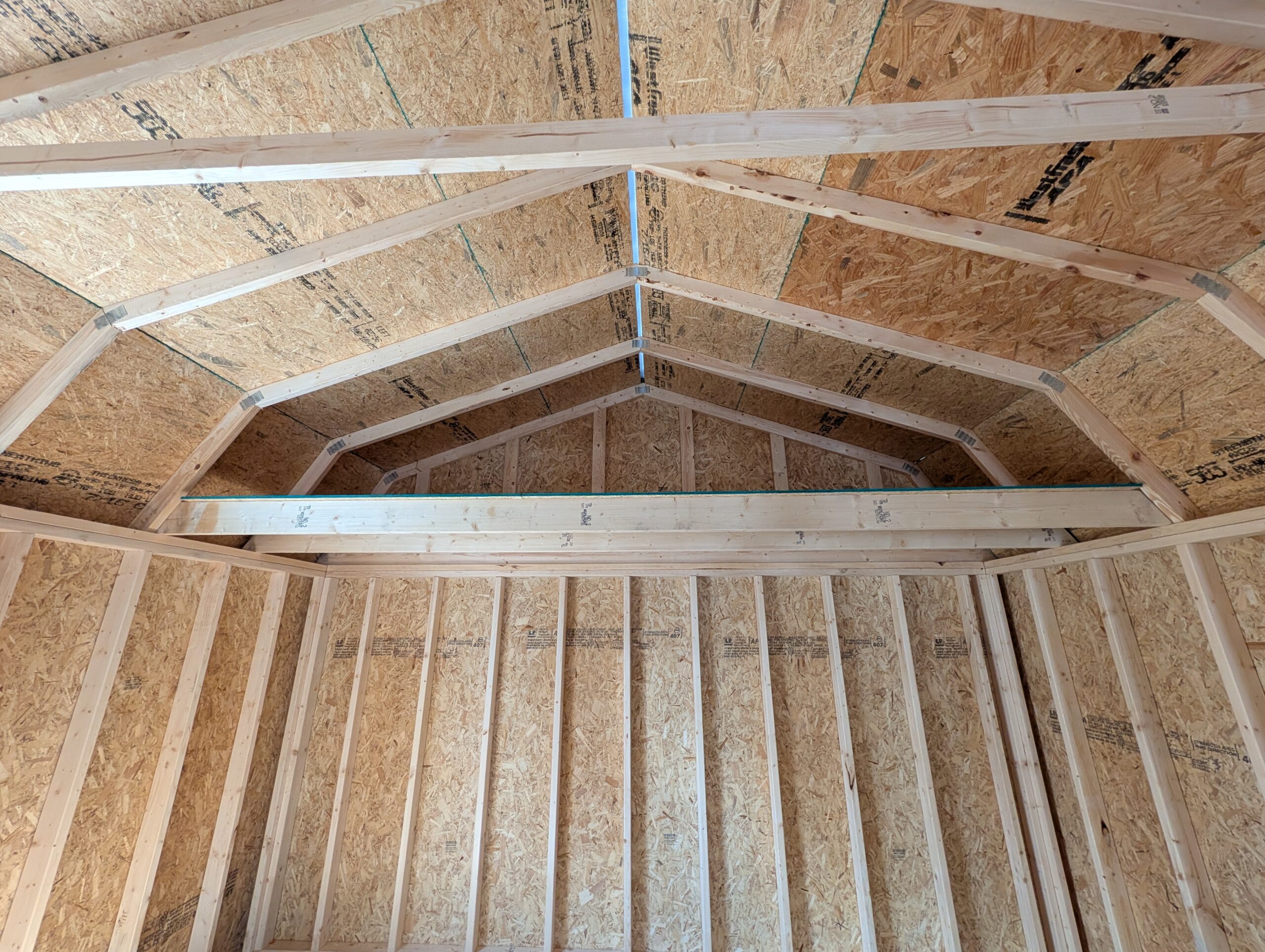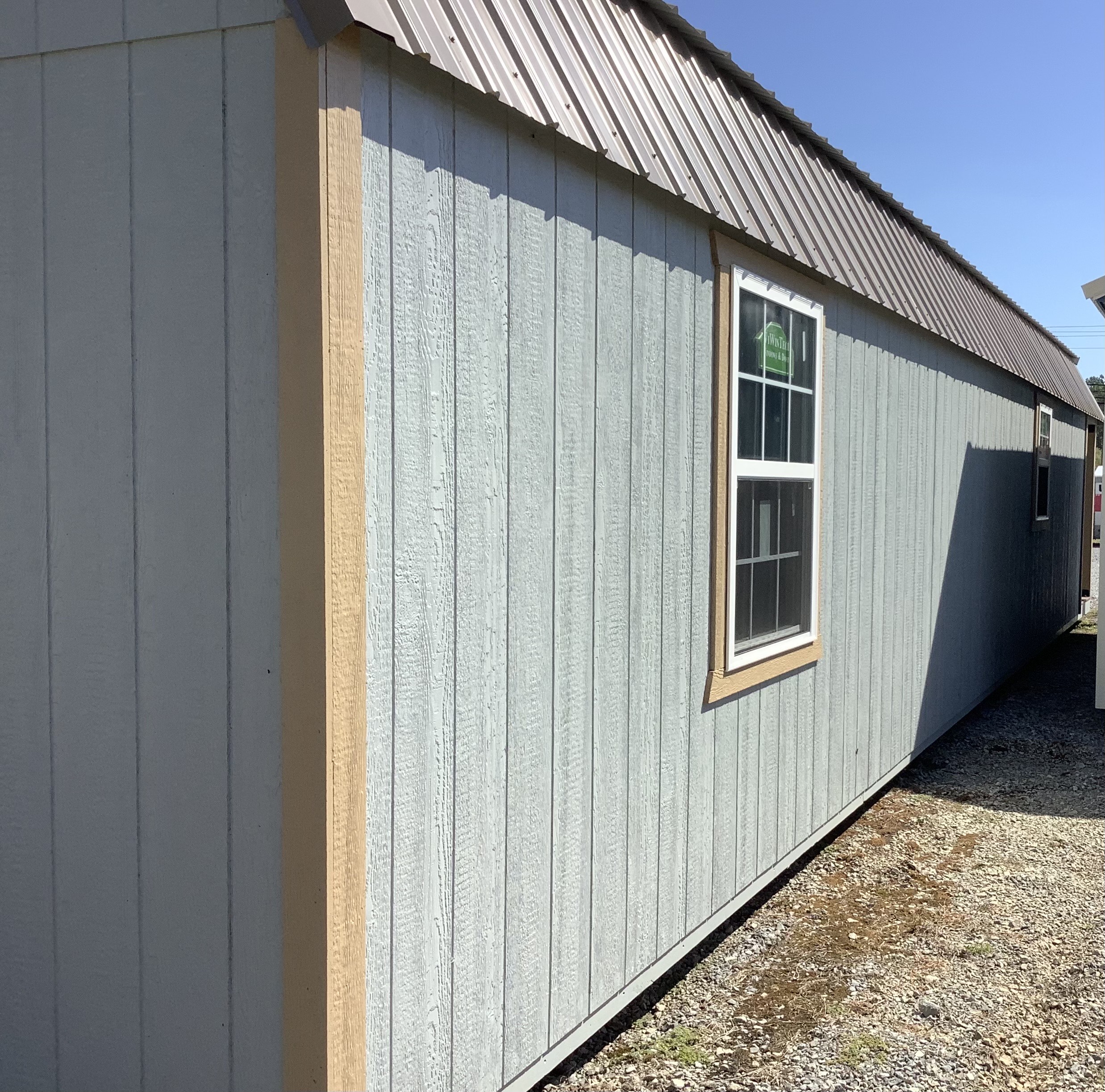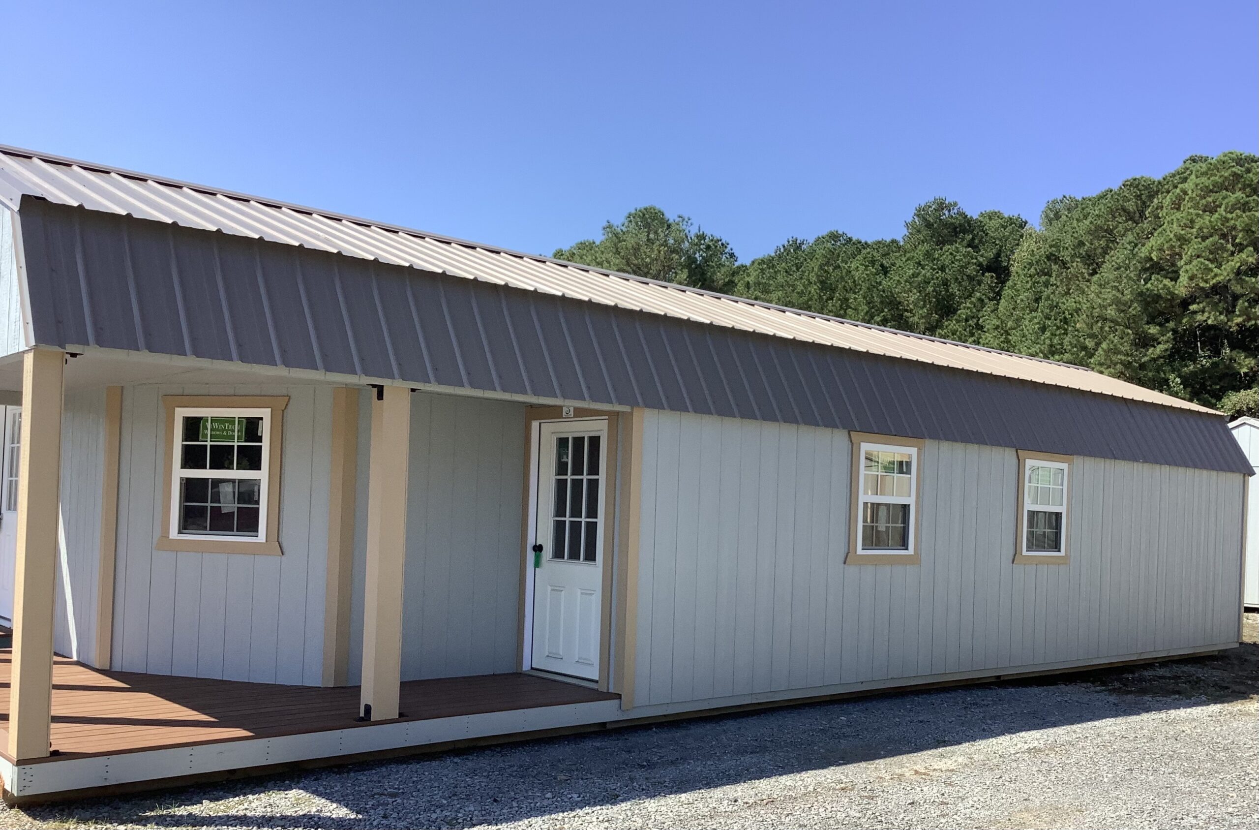 4′ W x 44′ L 1 x 9-Lite Entry Door 2 x 14′ Wide Loft Space 4 x 30×36 Thermal Windows (White) 1 x 36×48 Thermal Window (WHITE) 1 x Black POSTS 1 x Stud Wall (framing only) 1 x Door Frame Out 1 x Frame wall up to truss