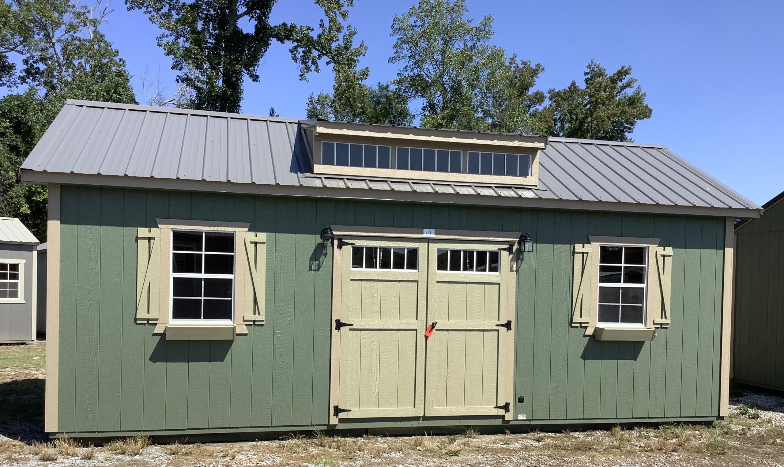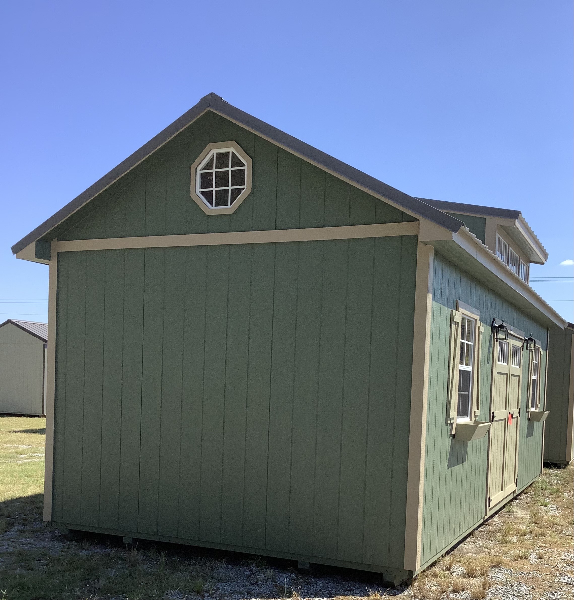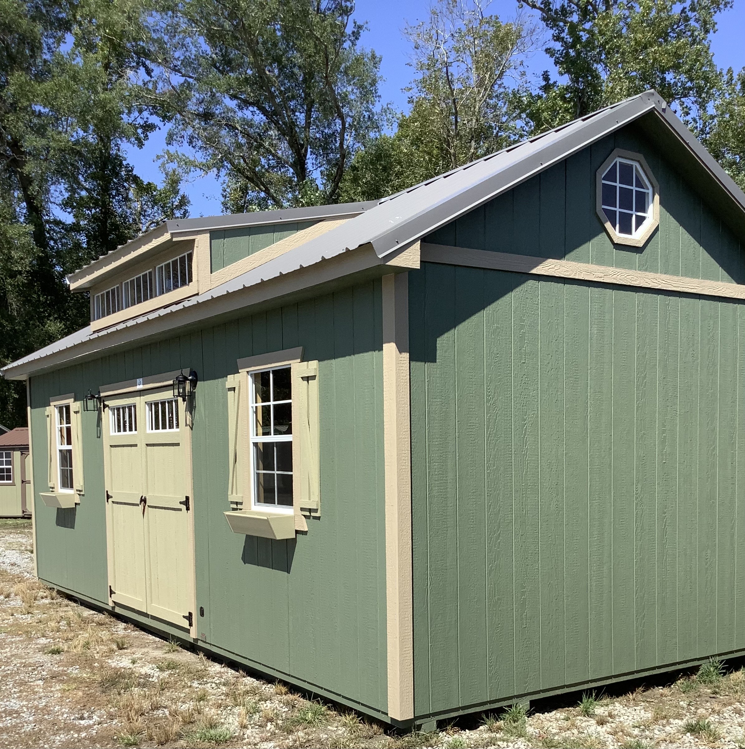 2′ W x 24′ L 2 x 18″ Octagon Window (WHITE) 2 x 24″ X 36″ Shed Window (WHITE) (with Wild Grasses Flowerbox, Wild Grasses Shutters) 1 x Heavy Duty Workbench 2 x Interior Light 2 x Exterior Lamp 1 x Switch/Outlet Combo 1 x 110 Receptacle 1 x Transom Doors 2 x 12′ Wide Loft Space 1 x 15 Lite Shed Dormer 1 x Any Color Option On Doors 1 x Wild